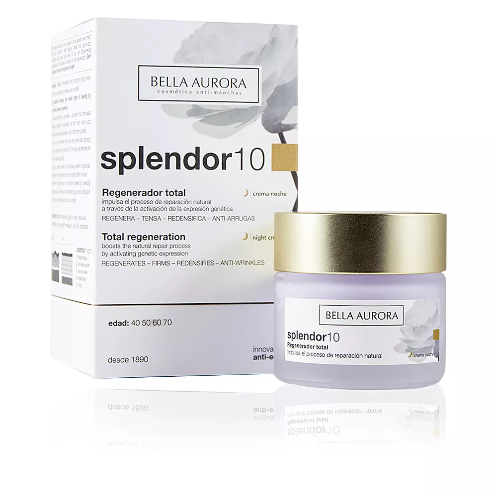 SPLENDOR 10 regenerador total noche của hãng Bella Aurora là một loại kem dưỡng da ban đêm chống lão hóa mạnh mẽ, dưỡng ẩm sâu cho da giúp phục hồi và tái tạo làn da xỉn màu. Được chiết xuất từ thạch anh tím và hoa nhài để dưỡng ẩm sâu, làm đều màu da và phục hồi độ đàn hồi, loại kem ban đêm Bella Aurora giúp giảm nếp nhăn, đường nhăn và cải thiện tông màu da tổng thể.