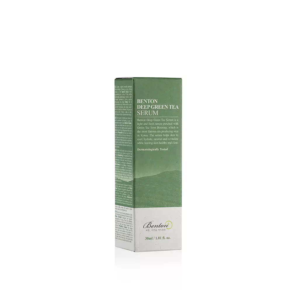 Deep Green Tea Serum của hãng Benton là một loại huyết thanh dưỡng ẩm và làm dịu da với chiết xuất từ trà xanh lên men, hyaluronic acid và ceramides. Sản phẩm này được thiết kế để giúp làm đều màu da, giảm kích ứng và tăng cường hàng rào bảo vệ da.