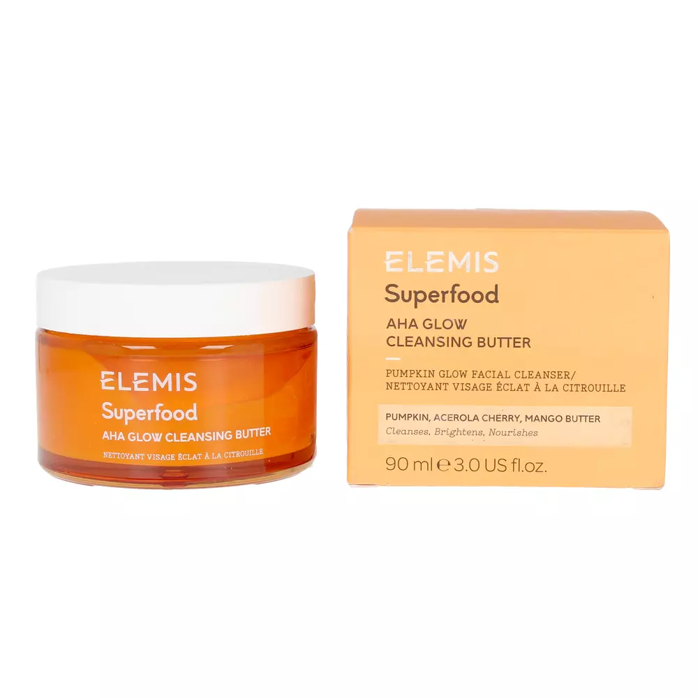 SUPERFOOD AHA Glow Cleansing Butter của Elemis là một loại bơ tẩy trang dưỡng ẩm giúp làm sạch nhẹ nhàng và tẩy tế bào chết cho da, mang lại làn da tươi tắn, rạng rỡ.