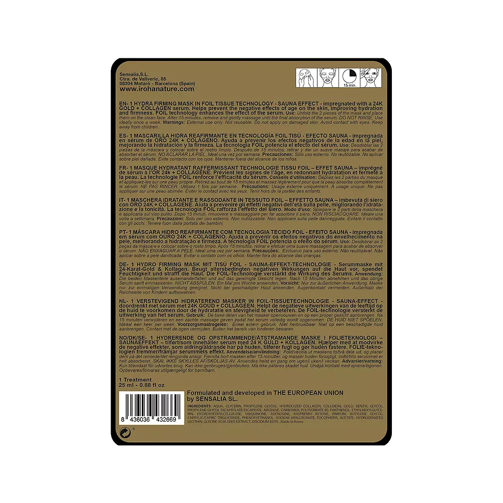 GOLD tissue hydra- firming face mask là mặt nạ dưỡng da có tác dụng làm săn chắc, nâng cơ và cấp ẩm sâu cho làn da đến từ thương hiệu mỹ phẩm thiên nhiên Iroha Nature. Mặt nạ này được làm từ sợi cellulose siêu mịn và mềm mại, với thiết kế ôm trọn khuôn mặt, giúp dưỡng chất thẩm thấu sâu vào da hiệu quả.