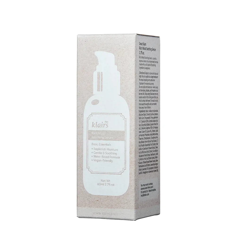RICH MOIST soothing serum là sản phẩm đến từ thương hiệu Klairs của Hàn Quốc, được thiết kế đặc biệt để làm dịu và dưỡng ẩm sâu cho làn da nhạy cảm và dễ kích ứng. Sản phẩm có các đặc điểm sau: