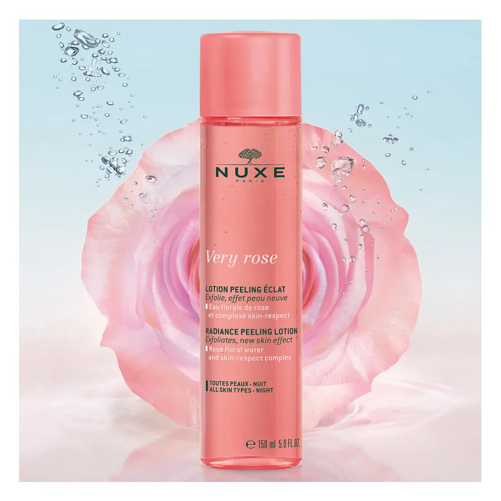 Nuxe VERY ROSE lotion peeling eclat giúp làm sáng da, tẩy tế bào chết nhẹ nhàng, mang lại làn da tươi mới, rạng rỡ.