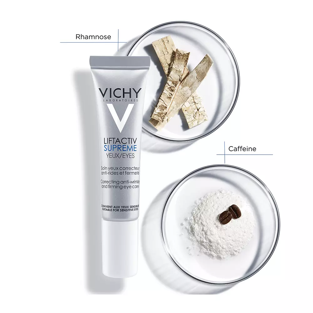 LIFTACTIV yeux của hãng Vichy Laboratoires là sản phẩm kem dưỡng mắt chứa thành phần Caffeine giúp giảm quầng thâm và bọng mắt. Ngoài ra, sản phẩm còn có các thành phần dưỡng ẩm giúp da mắt mềm mại, mịn màng. Một số thành phần chính của sản phẩm gồm: